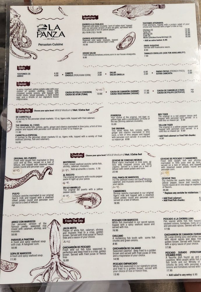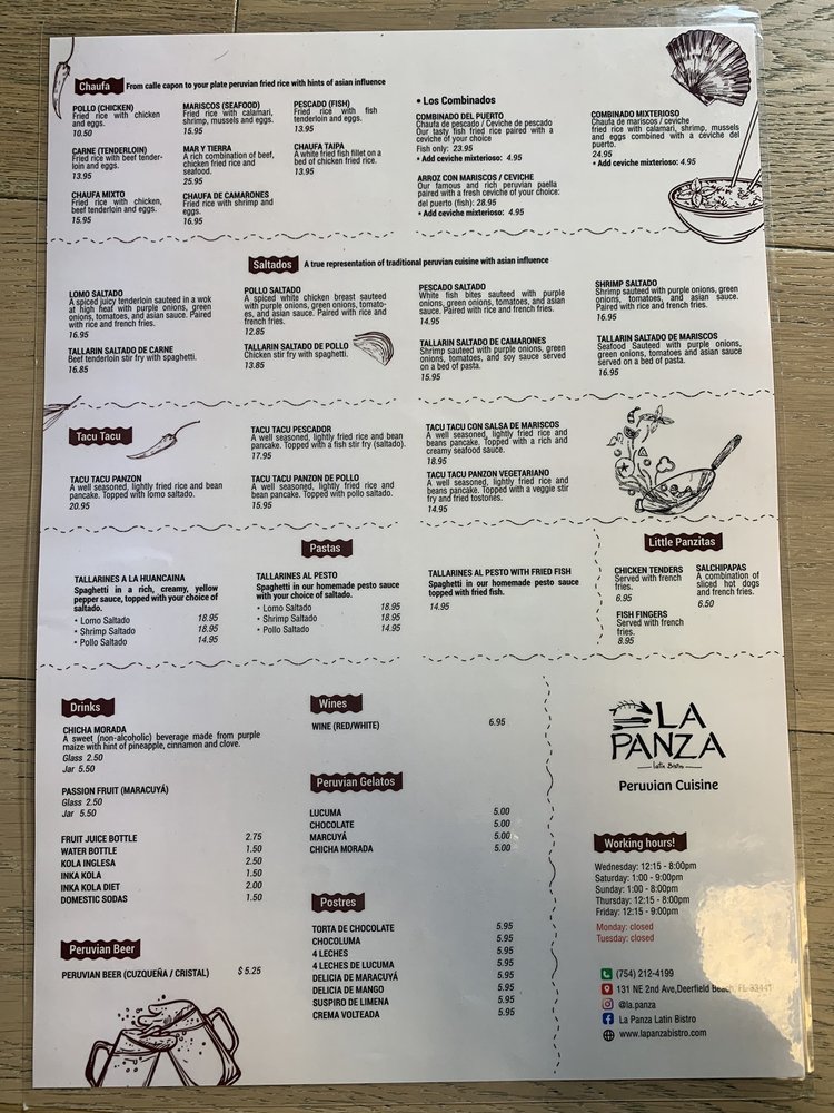 Introducing the menu at La Panza Latin Bistro, a Peruvian and Latin American restaurant that specializes in seafood dishes. Located in Deerfield Beach, FL, this bistro offers a variety of options for dining, including delivery, takeout, and catering services. Customers rave about the fresh ceviche, tacu tacu, and suspiro de limena dishes, all prepared with care by the owner and chef, Rodolfo. The ambiance is described as cozy and inviting, with outdoor seating available. Guests appreciate the attentive service and authentic Peruvian flavors served with passion. Highlights include the lomo saltado, jalea mixta, and causa de atun appetizer. Overall, La Panza Latin Bistro provides a delightful dining experience with a taste of Peruvian cuisine in a charming setting.